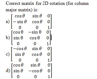 Correct matrix for 2D rotation (for column major matrix) is: